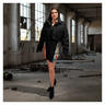 This is the ultimate elevated casual piece: a timeless black denim dress that offers a comfortable, yet chic, silhouette ideal for daily wear. Its essence, however, is transformed by an integrated panel of original art by Shannon Studios. The expressive, soulful artwork infuses the denim’s utility with an unexpected depth and visual punch.
