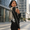 Paired with the coordinating, essential black shorts, this ensemble is a complete look of elevated contrast: bold lines meet radiant detail, and high fashion meets intimate artistry.