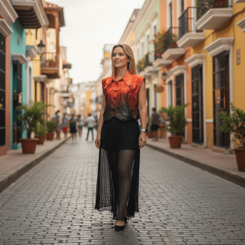 The sleeveless cut and refined collar make it the perfect foundation piece for layering or a standout solo statement. It’s where elevated texture meets enduring vision.