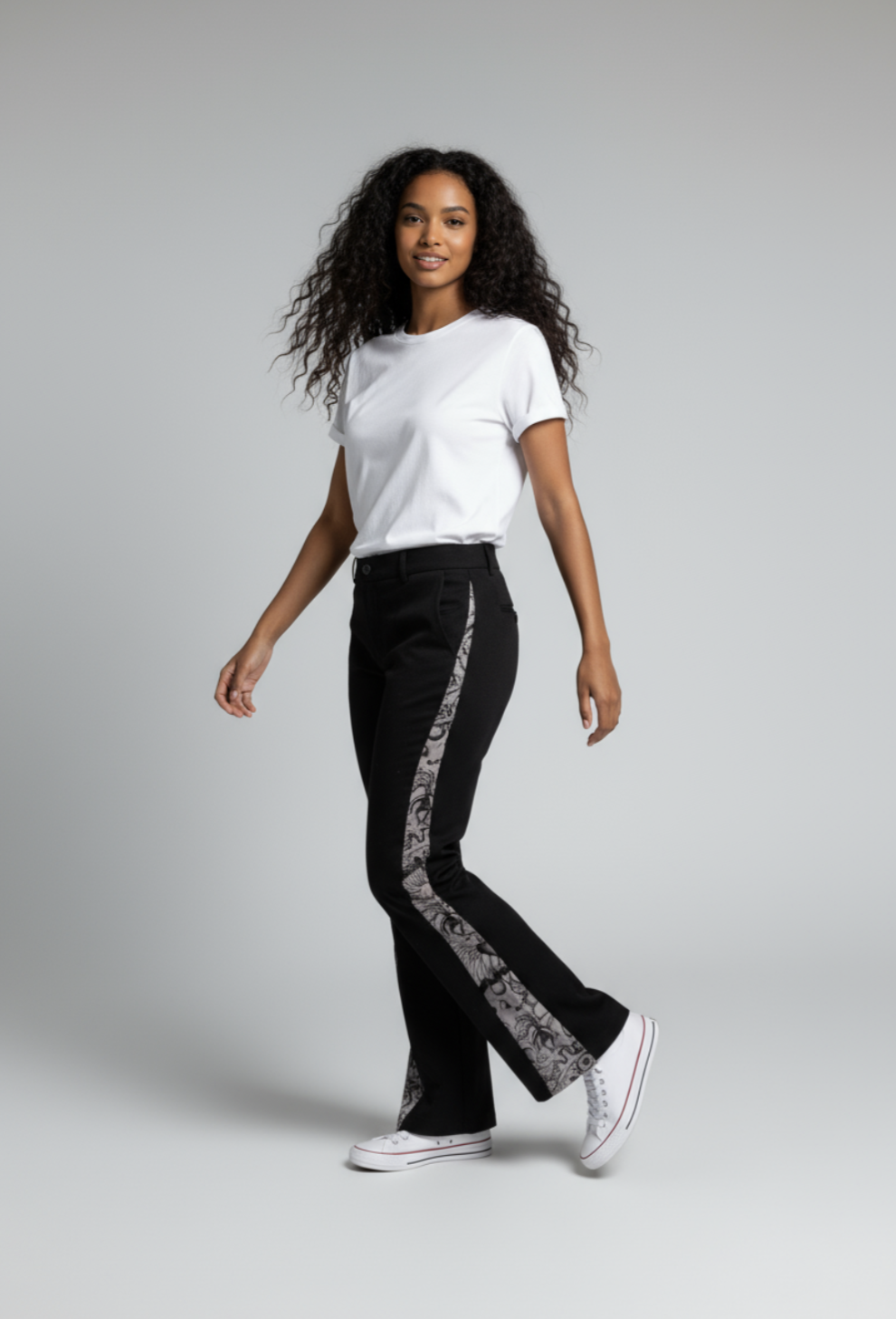 The “Musical Journey” Flares: Peek-A-Boo Art Introducing an instant classic from Fefe Couture: the Black Flared Jeans—a silhouette that commands attention and tells a story. Crafted from premium black denim, these jeans feature a dramatic, leg-lengthening flare. The intrigue lies in the subtle artistry: a strategically placed “peek-a-boo” panel reveals the exclusive “Musical Journey” artwork by Shannon Studios. This art is a kinetic visual narrative, glimpses of which appear and disappear with every step. The design is a sophisticated harmony of casual structure and vibrant expression, allowing you to carry your rhythm with you. Walk the line. Wear…