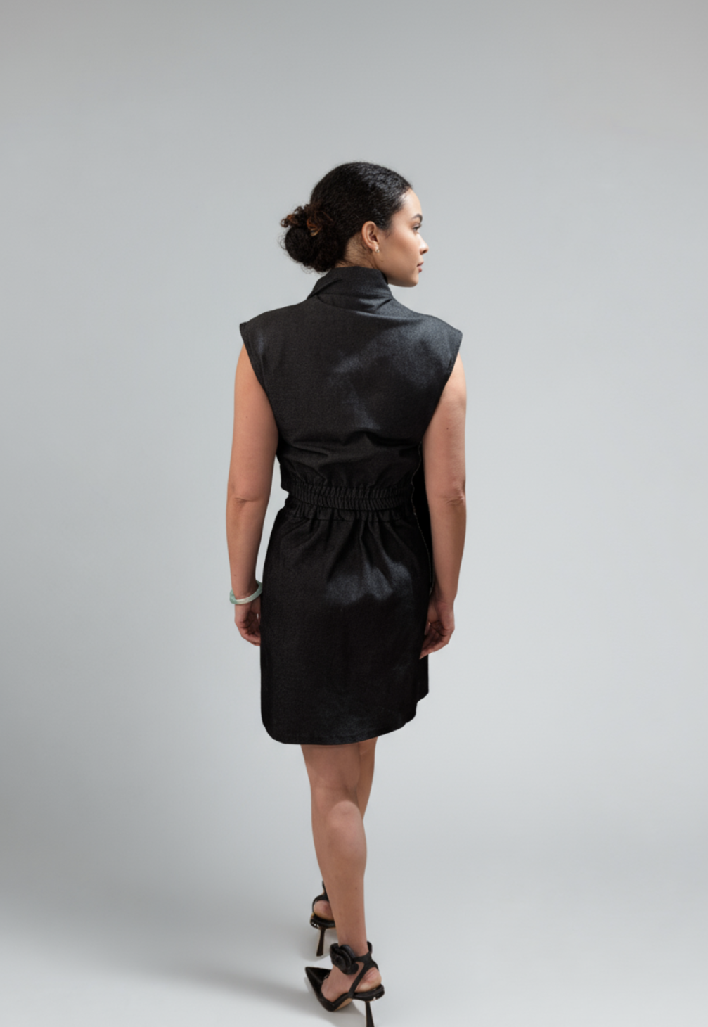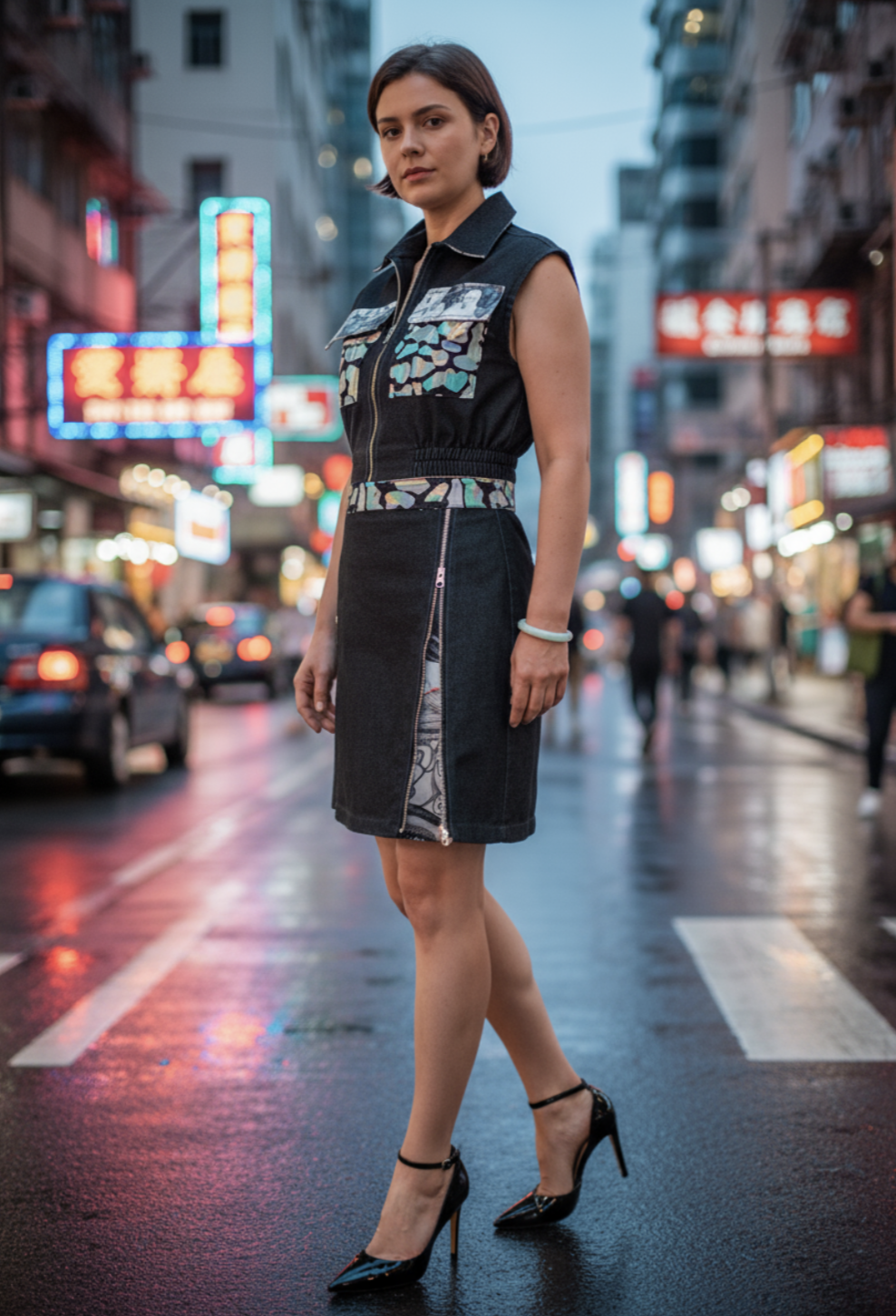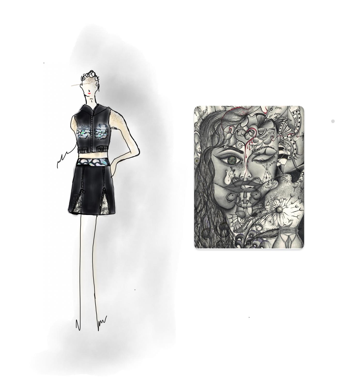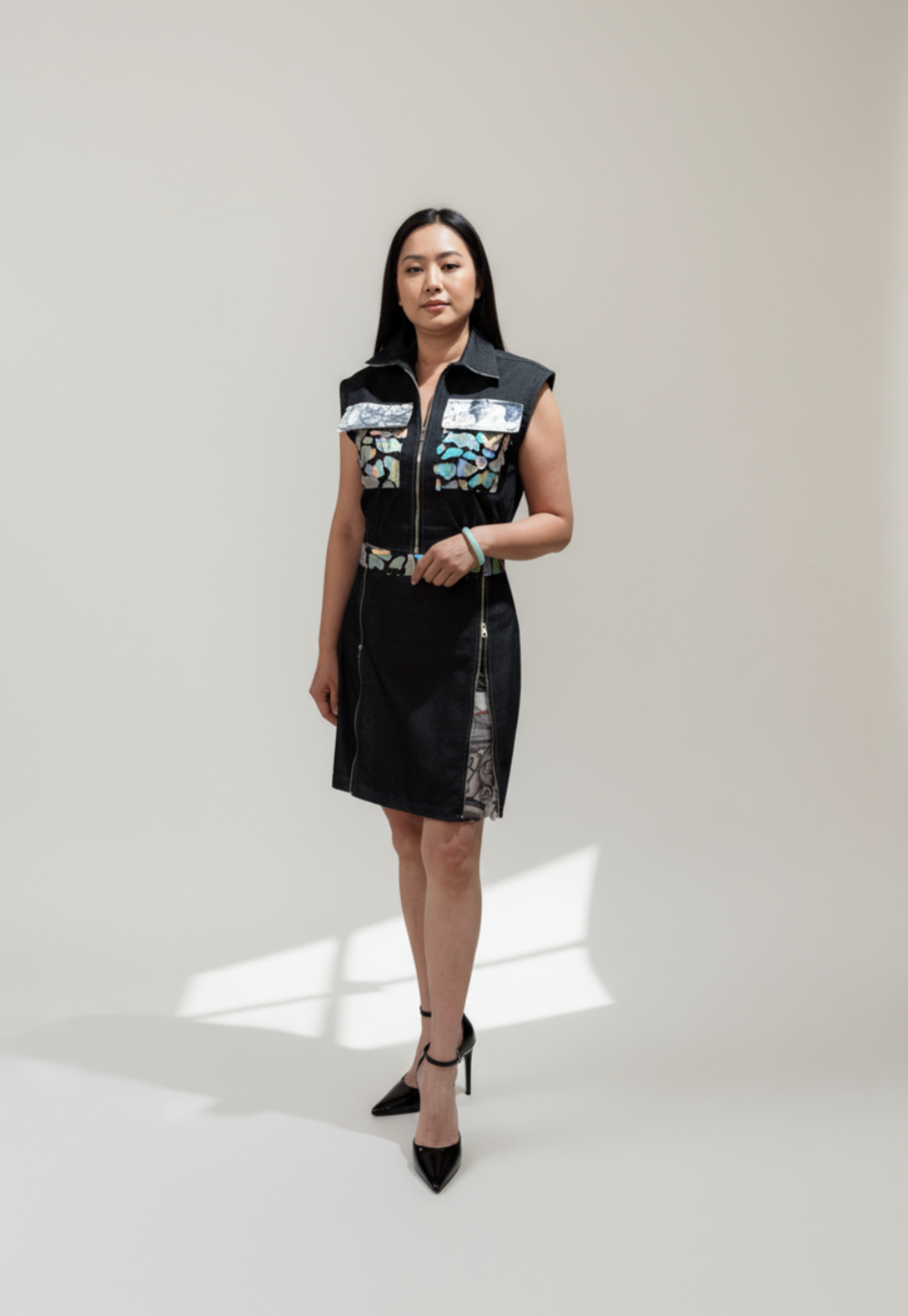 The Sentinel Set: Reflection and Revelation From Fefe Couture comes the Sentinel Set—a future-forward pairing designed for dynamic presence. The ensemble centers around a sharp, contemporary Cropped Vest, distinguished by strategic reflective accents that capture light and command attention in motion. This utilitarian structure is punctuated by art: the vest’s pockets feature detailed, original artwork by Shannon Studios. Paired with the coordinating Skirt, the set creates a balanced, compelling silhouette. It is a fusion of high-visibility edge and subtle artistic depth, ensuring your statement is seen, heard, and remembered. Light the path. Carry the art.