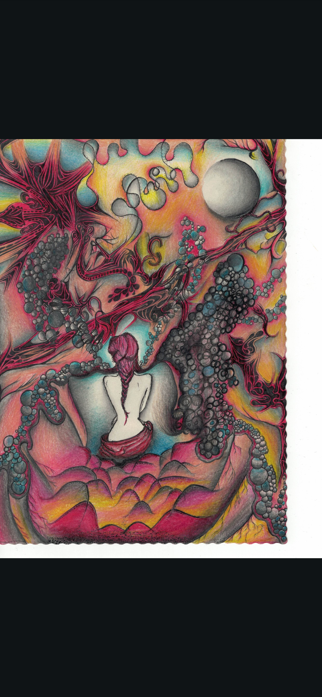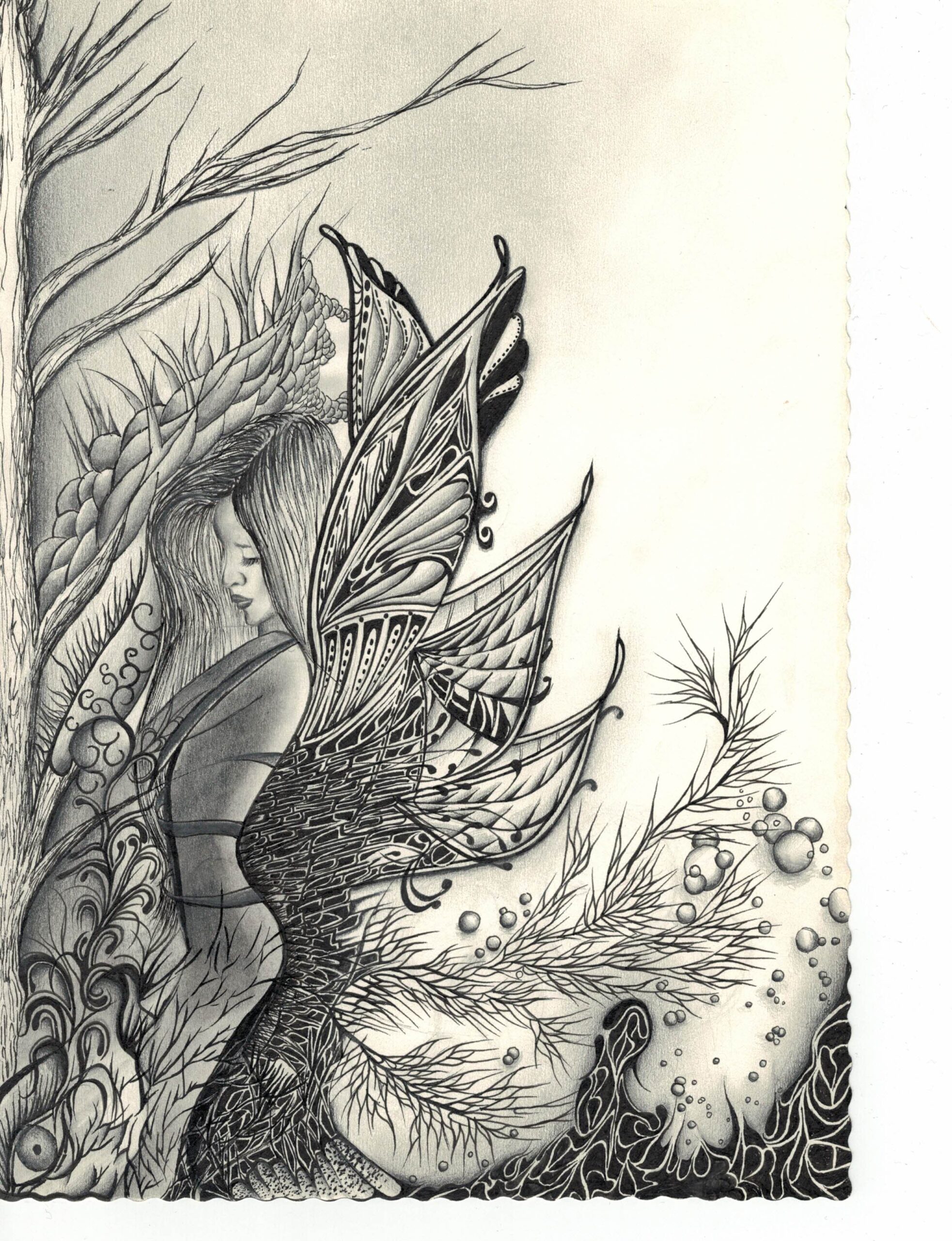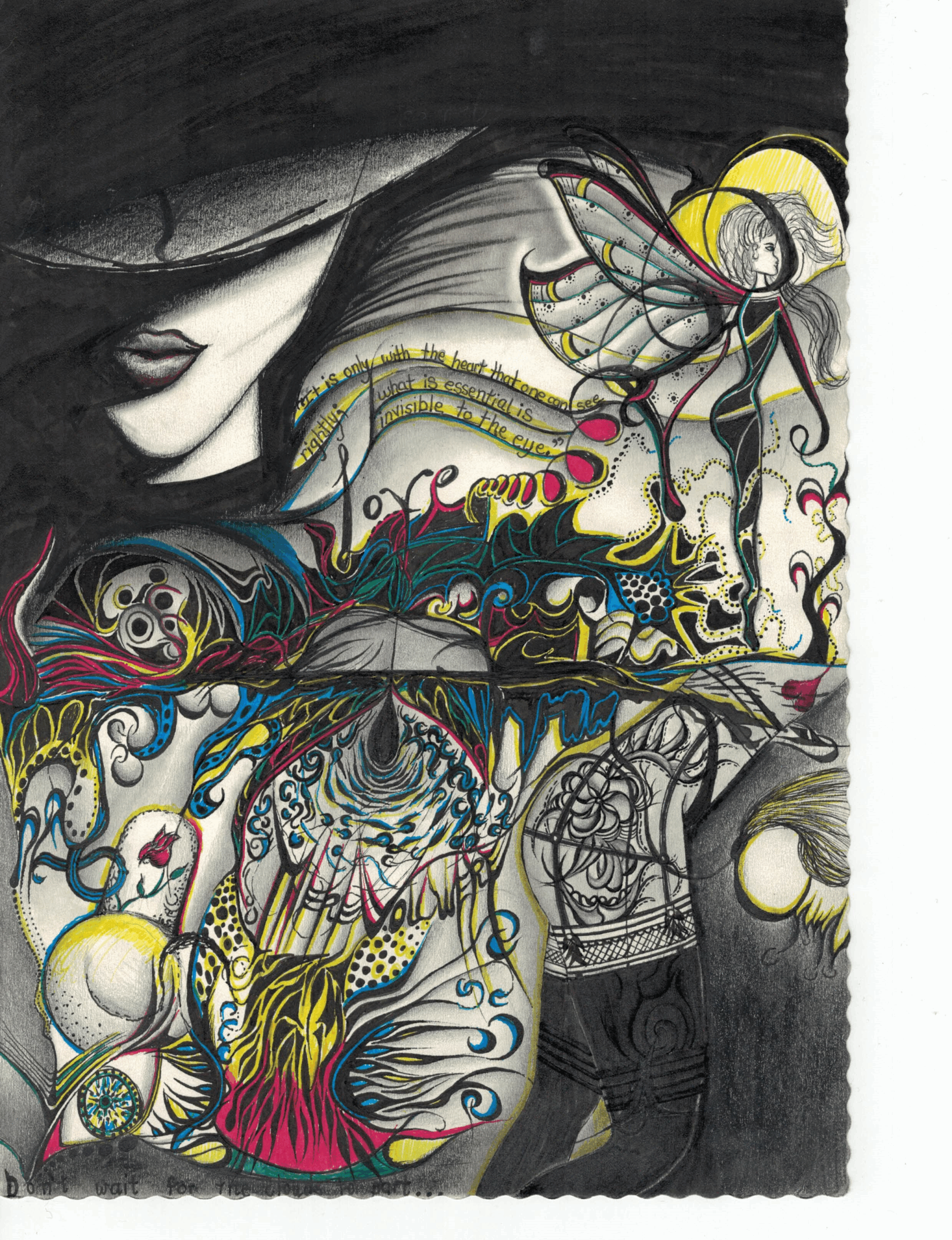 These four pieces, all wrapped up in 2022. They are Shannon’s visual diary, depicting every step of her personal adventure. While some folks journal or get their zen on with meditation, she grabs her pens and pencils. Drawing is her happy place for mental well-being, helping her spill out swirling thoughts, feelings, reflections, and all those burning questions.